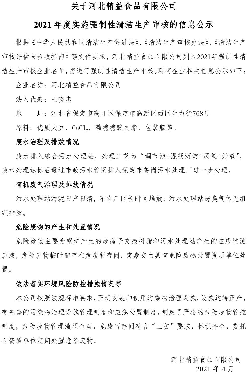 根据“中华人民共和国清洁生产促进法”、“清洁生产审核办法”、“清洁生产根据《中华人民共和国清洁生产促进法》、《清洁生产审核办法》、《清洁生产审核评估与验收指南》等文件要求,河北精益食品有限公司列入2021年强制性清洁生产审核企业名单,需进行强制性清洁生产审核。现将企业相关信息公示如下: